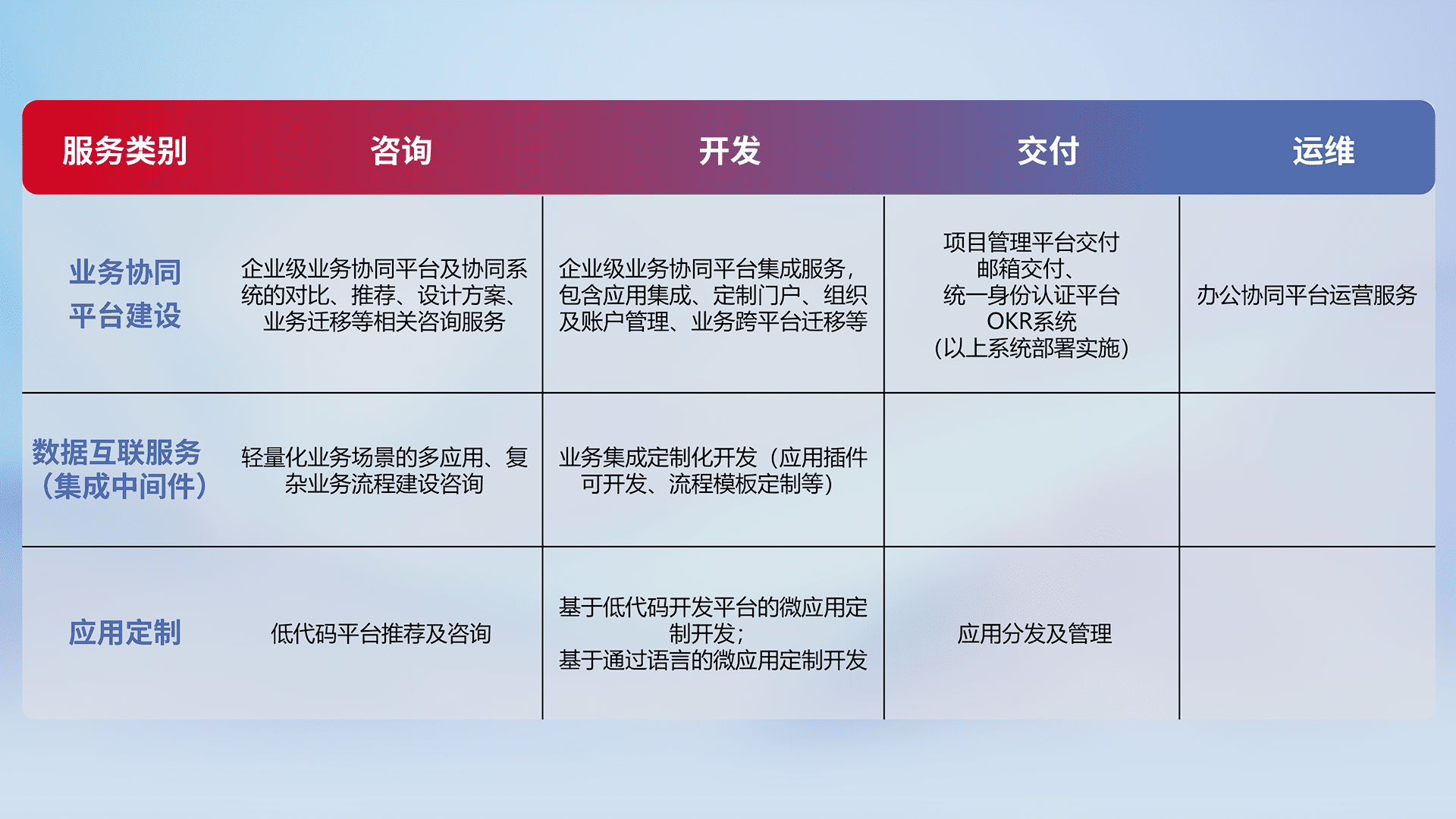 针对钉钉、、、企微、、IDaas等平台级产品提供产品的规划、、方案、、、交付、、定制化开发等服务,,,实现如统一协同办公、、、、智能客户服务、、、混合会议管理、、、、智能数据查询、、、、等业务场景,,,,实现数字化转型。。